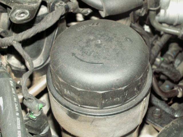 Unscrew cap, lift slowly incase canister full of oil, swap filter... change the large o-ring... a lot of them non-Hyundai rings or used ring are too small diameter to seal to the canister real well..