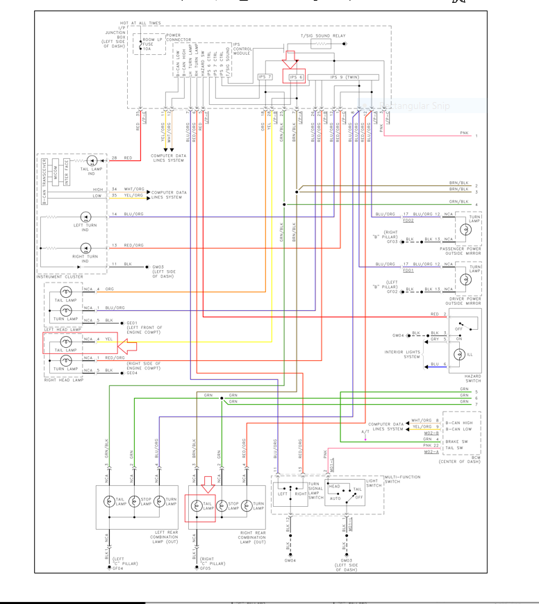 Above is a post from another Hyundai site that discusses a 2012 Sonata wiring circuit issue. Probably, u r 2013 is much if not exactly the same. Aside from the technical jargon, here's what I got from it. The right tail light and the right front lights stopped working, The IPS....smart switch....replaces the fuse and relay in that circuit There are several IPS switches protecting several different wiring circuits. The "smart" part of the IPS senses when current is either too high r too low then shuts off the electrical current. Because it is solid state...and modern... the switch is 99.9% infallible. As a test, disconnect the rear inoperative light. If the front starts working then bingo, the IPS is good and the wires from the IPS in the fuse box to the tail light have a short. If the front light does not turn on then reconnect the rear light and pull the front. If the back light starts working then bingo, the short is in the front. Does any of this make sense? Is only one side of your tail and front light not working? Like Hanky stated we need to know exactly what is going on with your auto. I've also attached a couple of interesting...to Hanky...images Thanks